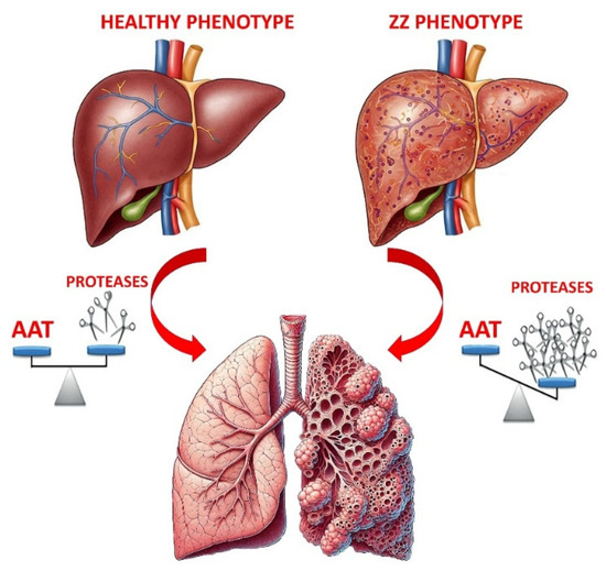 1. Low AAT levels in the blood: The lungs are left vulnerable to attack by neutrophil elastase, which slowly destroys the alveoli (air sacs), leading to emphysema and COPD.