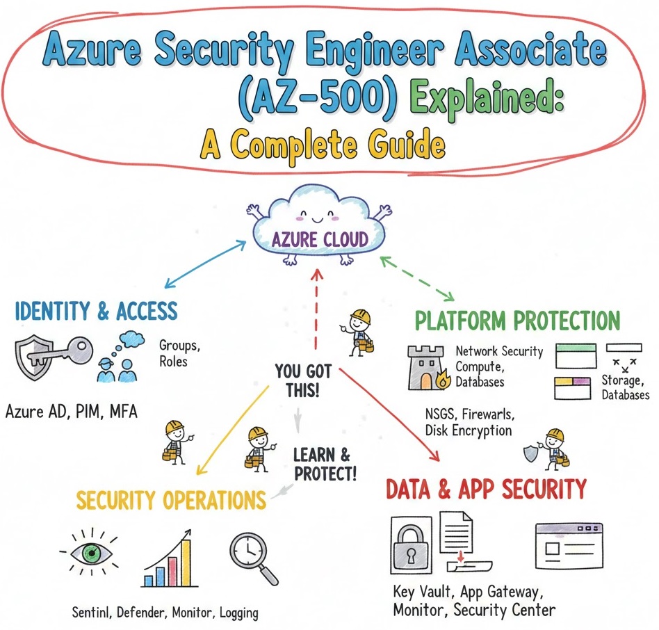 | Azure Security Engineer Associate (AZ-500) | Cloud Security | Associate | Security Engineers, Cloud Engineers, DevOps Engineers, Managers | Basic Azure knowledge is recommended | Managing identity and access, platform protection, security operations, data protection, network security | Azure Fundamentals → AZ-500 |