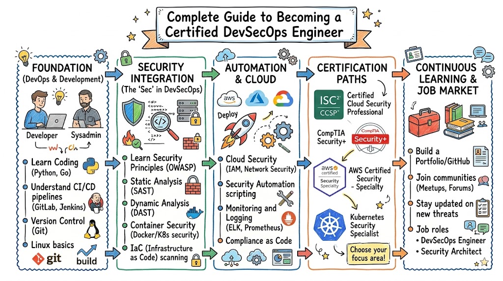 Modern software moves fast. Features are released weekly or even daily. But if security is weak, one bad change can cause data leaks, downtime, or huge business loss.Certified DevSecOps Engineer is a certification that helps you learn how to build software that is both fast and secure, from code to production. It teaches you how to add security into every step of DevOps, without slowing teams down.In this guide, I will explain this certification in simple language, with a clear roadmap you can follow as an engineer, manager, or technical leader.