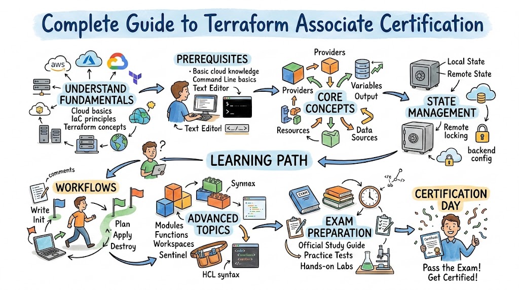 The fastest way to fail this certification is to treat it as a theory exam. The fastest way to pass it and also gain job value is to build while you study. Create a small cloud environment. Define it in Terraform. Split code into modules. Use variables. Change something. Run plan. Apply it. Review state behavior. Destroy the environment. Repeat. That full cycle teaches more than reading many notes. This advice is strongly aligned with DevOpsSchool’s emphasis on hands-on labs, real examples, practical projects, and workflow understanding.