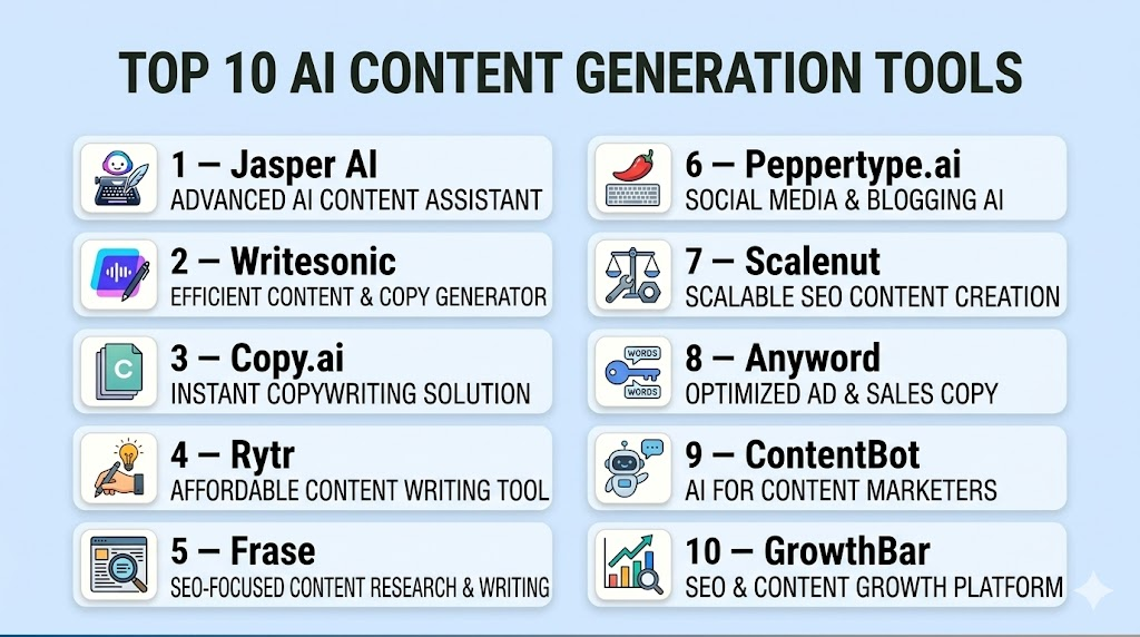 Rytr and Copy.ai are beginner-friendly, while Jasper AI, Writesonic, and Frase offer advanced features for professionals.