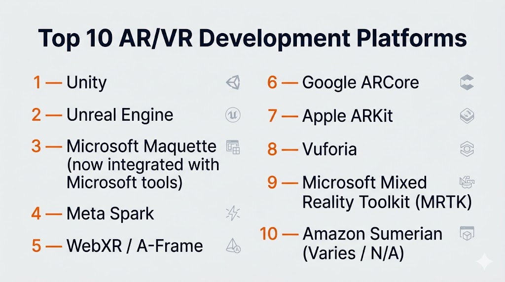 AR/VR Development Platforms are the engines powering immersive experiences across entertainment, enterprise, training, and visualization. Platforms like Unity and Unreal Engine dominate with scalable, crossโplatform capabilities, while web standards like WebXR open doors for easy distribution. Mobile AR SDKs like ARCore and ARKit anchor mobile experiences, and niche tools like Meta Spark and Maquette accelerate rapid prototyping and social content creation. The right choice depends on your project complexity, platform targets, team skills, and budget. Shortlist 2โ3 platforms, prototype real interactions, and test performance and tooling integrations before committing to a longโterm development pipeline.