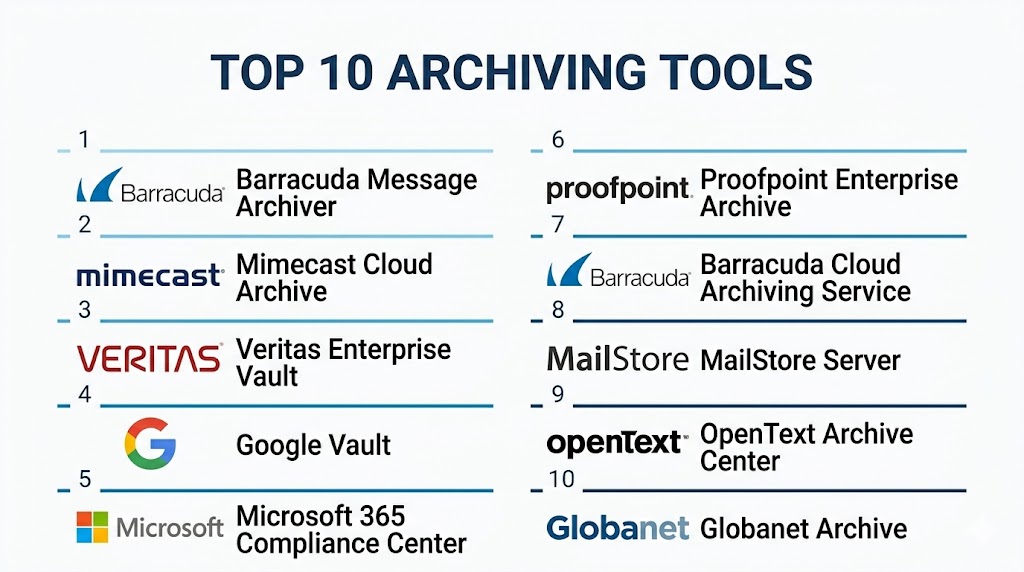 - Veritas Enterprise Vault, Proofpoint Enterprise Archive, OpenText Archive Center, or Globanet Archive deliver enterprise-grade compliance, retention, and search across multiple data sources.