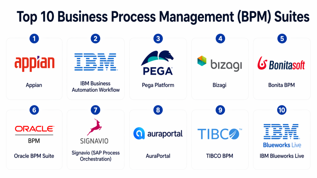 Business Process Management (BPM) Suites empower organizations to streamline workflows, enhance process visibility, and enable automation across departments. Choosing the right BPM suite depends on company size, process complexity, integration needs, and compliance requirements. SMBs may benefit from Bizagi or AuraPortal, while enterprises gain value from Appian, Oracle BPM Suite, or Pega. Piloting 2โ3 platforms helps validate features, scalability, and integration compatibility, ensuring long-term process efficiency and governance.