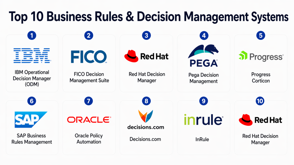 Business Rules & Decision Management Systems empower organizations to automate, govern, and optimize critical decisions while ensuring compliance and consistency. Choosing the right platform depends on organizational size, decision complexity, integration needs, and AI requirements. SMBs benefit from low-code tools like Progress Corticon or Decisions.com, while enterprises achieve scale with IBM ODM, Pega, or SAP BRM. Shortlisting 2โ3 platforms and running a pilot helps validate capabilities, integration, and compliance, ensuring long-term decision automation success.