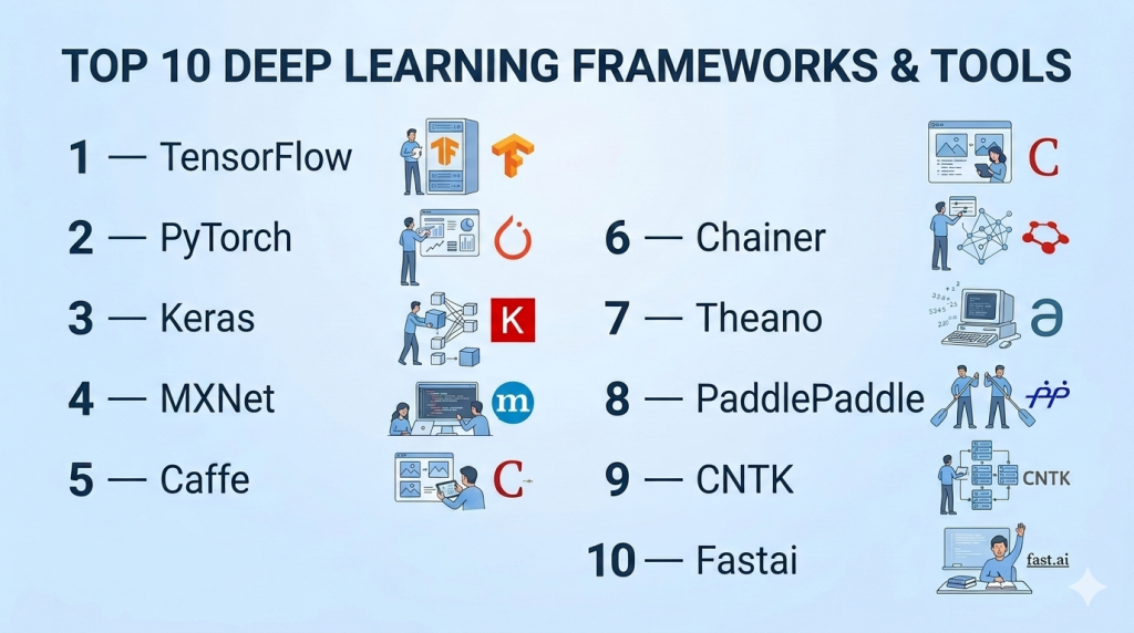 Deep learning frameworks are the foundation for building modern AI applications. Open-source frameworks like PyTorch, TensorFlow, and Keras provide flexibility and rapid prototyping capabilities, while enterprise-grade frameworks such as MXNet, PaddlePaddle, and CNTK enable scalable and secure production deployments. Selecting the right framework depends on team size, compute requirements, deployment environment, and enterprise compliance needs. Evaluating integrations, performance, and community support ensures the platform fits the organization’s AI strategy. Running pilot projects or experiments is recommended to validate suitability before committing to full-scale deployment.