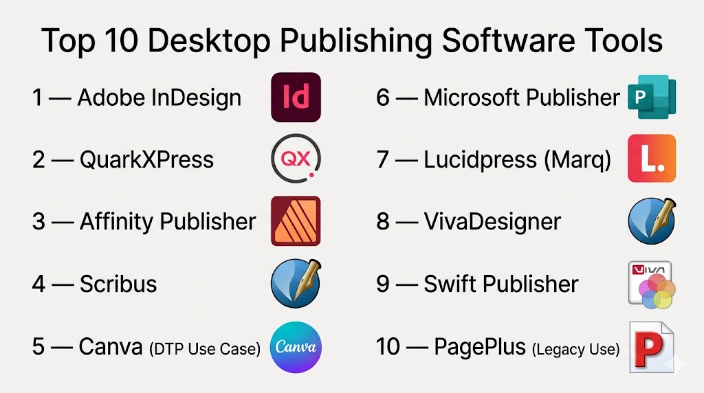 Desktop Publishing Software (DTP) refers to tools used to design, layout, and produce high-quality printed and digital documents such as magazines, brochures, books, catalogs, and marketing materials. These tools combine text formatting, image placement, and page layout capabilities to create professional-grade publications.