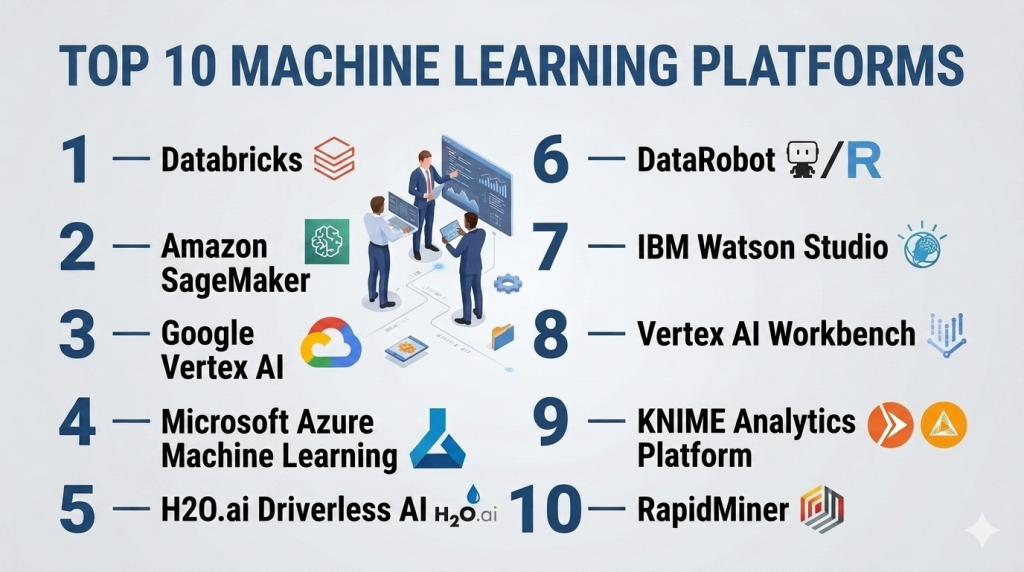 Machine learning platforms are essential for enterprises seeking to implement AI and predictive analytics at scale. The “best” platform depends on team size, deployment preferences, budget, required frameworks, and compliance needs. Open-source tools like KNIME or H2O.ai are flexible and cost-effective for small to mid-sized teams, while cloud-native enterprise solutions such as Databricks, SageMaker, Azure ML, and Vertex AI provide scalability, MLOps pipelines, and collaboration for large organizations. Buyers should evaluate integration capabilities, performance, and security before committing. Running pilot projects or trials can help organizations determine the best platform fit, ensuring ML initiatives deliver maximum business impact
