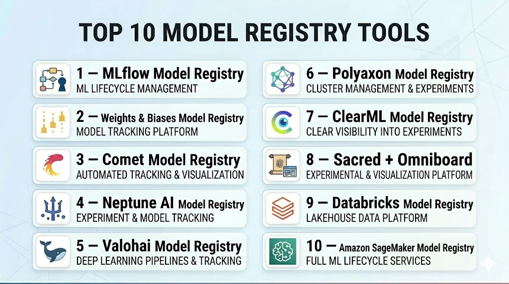 Model Registry Tools are essential for enterprises managing production-grade ML models. They ensure reproducibility, enable collaboration, provide version control, and support governance across ML workflows. Open-source options like MLflow, Guild AI, and DVC offer flexibility and cost savings, while enterprise tools like Weights & Biases, Neptune AI, and Valohai deliver dashboards, collaboration, and integration with MLOps pipelines. Choosing the right model registry depends on team size, workflow complexity, infrastructure, and compliance requirements. Pilot projects and trials are recommended to validate integration, usability, and scalability before full-scale deployment.