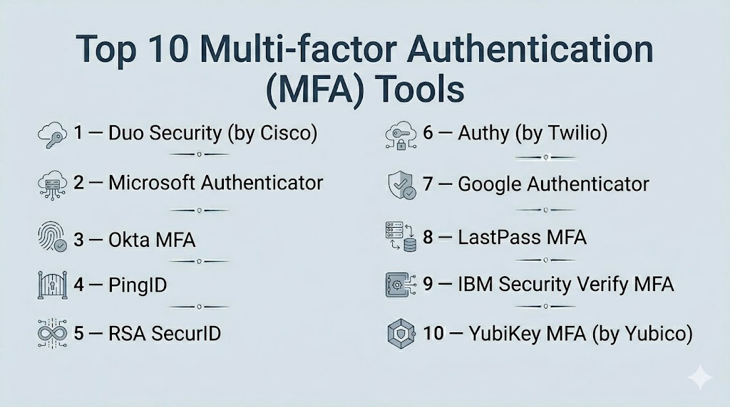 Multi-factor Authentication (MFA) is essential for protecting modern digital assets against unauthorized access and credential theft. Small teams may leverage Google Authenticator or Authy for ease of use, whereas enterprises should invest in Okta MFA, RSA SecurID, and YubiKey for advanced adaptive authentication, hardware token support, and compliance. Selecting the right MFA solution requires assessing deployment complexity, integration needs, user experience, and regulatory requirements. Organizations should pilot, monitor, and refine MFA policies to maximize security without compromising productivity.
