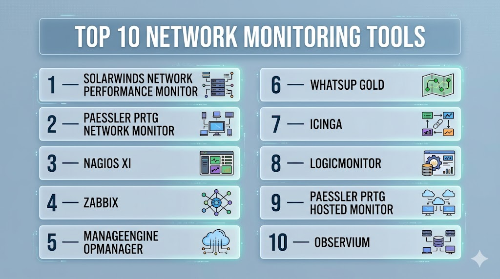 Network Monitoring Tools are essential for IT operations, SRE teams, and managed service providers aiming to maintain high-performance, reliable networks. Enterprise platforms like SolarWinds NPM, LogicMonitor, and Nagios XI provide AI-driven insights, multi-site scalability, and predictive analytics, while open-source tools such as Zabbix and Observium offer flexibility for SMBs and technical teams. Choosing the right platform depends on organizational size, network complexity, compliance requirements, and budget. Teams should pilot tools, validate integrations, and leverage real-time analytics to proactively manage network health and optimize performance.