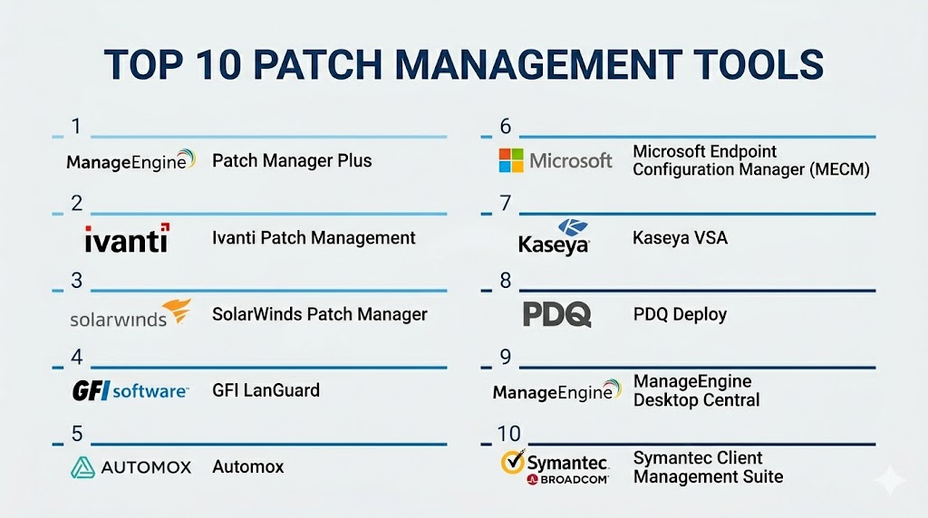 - Ivanti Patch Management, Microsoft Endpoint Configuration Manager, or SolarWinds Patch Manager provide enterprise-grade features, compliance reporting, and deep integrations.