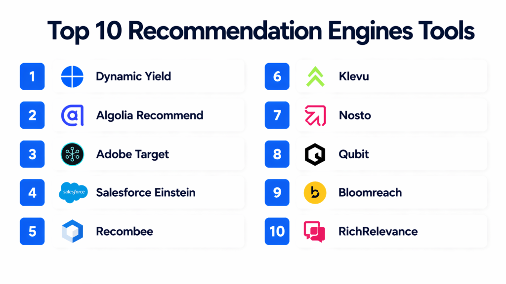 Recommendation engines are critical for businesses aiming to deliver personalized, engaging, and conversion-optimized digital experiences. While enterprise platforms like Adobe Target, Salesforce Einstein, and Dynamic Yield provide depth and omnichannel capabilities, SMBs and developers can achieve strong results with tools like Recombee, Algolia Recommend, or Nosto. Selecting the right tool requires balancing features, ease of integration, scalability, security compliance,