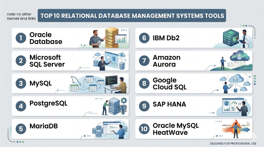 Relational Database Management Systems remain the foundation of structured data storage, transaction processing, and analytics. Selecting the right RDBMS requires balancing scalability, performance, security, and integration needs. Open-source options like MySQL and PostgreSQL suit cost-conscious teams, while enterprise-grade solutions like Oracle Database, SAP HANA, and Amazon Aurora address advanced workloads with high availability and AI-driven optimization. Organizations should evaluate deployment, integration, and compliance requirements, pilot selected platforms, and align database strategy with long-term data management goals.