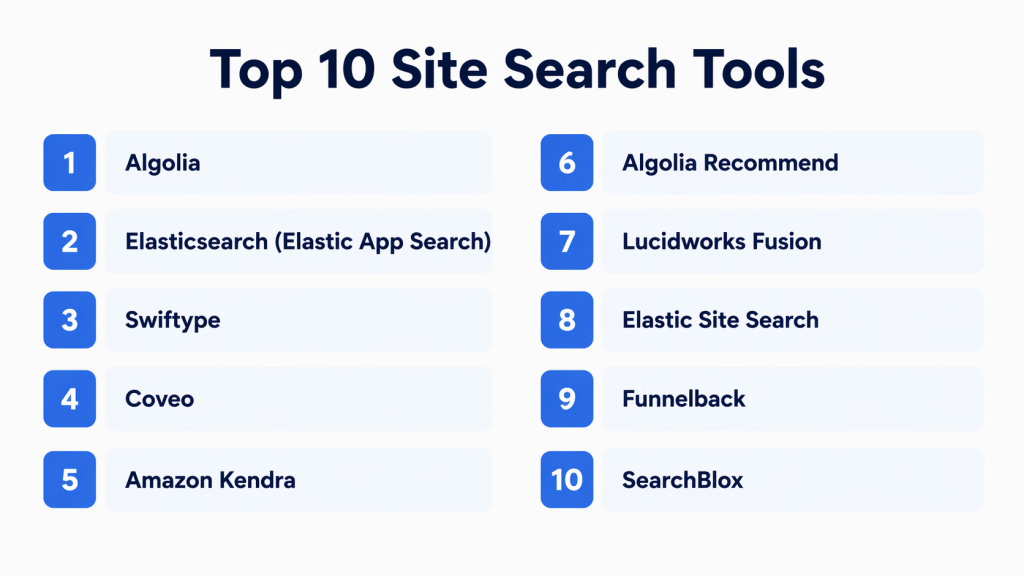 Site search tools have become critical for delivering fast, relevant, and personalized search experiences across digital properties. From SMB websites to enterprise portals, these platforms improve content discovery, engagement, and operational efficiency.Choosing the right solution depends on your website size, content complexity, deployment preferences, and integration requirements. Testing a few options with real-world data and workflows ensures that your selected platform meets your organizationโ€™s search expectations while delivering actionable insights.