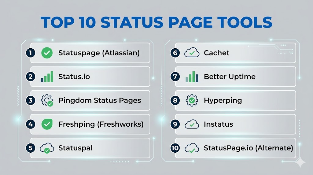 Status Page Tools are essential for communicating service health, incidents, and maintenance events transparently to users and internal teams. Enterprise solutions like Statuspage (Atlassian), Status.io, and StatusPage.io offer robust automation, multi-channel notifications, and integrations for high-scale operations. SMBs and startups can benefit from Freshping, Statuspal, and Pingdom for cost-effective, user-friendly status communication. Selecting the right tool depends on team size, integration needs, branding requirements, and compliance considerations. Organizations should shortlist suitable options, pilot in real scenarios, and validate notification workflows to enhance transparency, reduce support load, and maintain user trust.