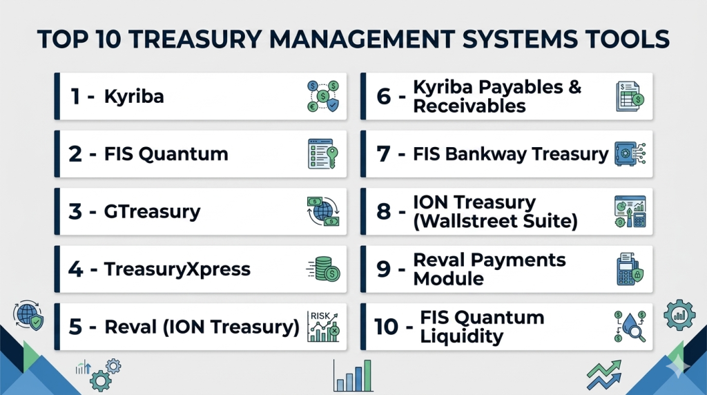 Treasury Management Systems are essential for organizations managing complex cash flows, payments, and financial risk. Modern TMS platforms provide real-time cash visibility, automated payment workflows, and predictive analytics, helping treasury teams make informed, strategic decisions. Mid-market organizations benefit from solutions like GTreasury and TreasuryXpress, while large enterprises gain value from Kyriba, FIS Quantum, and ION Treasury. Selection should be guided by company size, transaction volume, integration requirements, security and compliance needs, and total cost of ownership. Organizations should shortlist a few platforms, validate their integration and compliance capabilities, and run pilot projects to identify the optimal solution for their treasury operations.