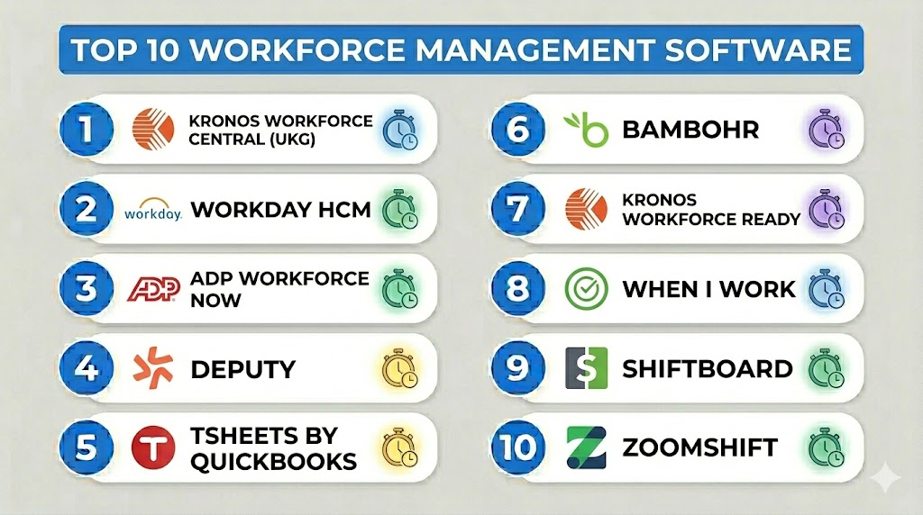 Workforce Management Software enables organizations to optimize scheduling, improve compliance, and enhance employee productivity. While tools like ZoomShift and Deputy are ideal for small teams, enterprise solutions such as Kronos Workforce Central and Workday HCM deliver comprehensive capabilities for complex, multi-location operations. Selecting the right solution depends on team size, scheduling complexity, compliance needs, and integration requirements. Organizations should shortlist 2–3 tools, run pilot programs, and validate integrations and security to maximize ROI and adoption